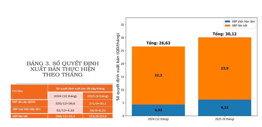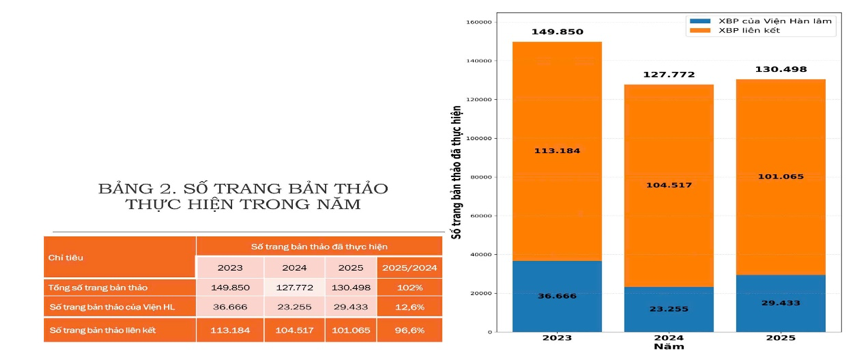 PGS.TS. Phạm Minh Phúc, Q. Giám đốc Nhà xuất bản và Tạp chí Khoa học xã hội đã nhấn mạnh những thành tựu, hạn chế, chỉ ra nguyên nhân, đặc biệt là nêu những con số ấn tượng mà Nhà xuất bản và Tạp chí đã đạt được trong năm 2025. Trong năm vừa qua, cả mảng tạp chí, xuất bản, phát hành sách đều có những bước phát triển đáng ghi nhận. Tạp chí đã hoàn thành được các số quy định với chất lượng tốt. Xuất bản đã hoàn thành được số lượng đầu sách ấn tượng trong khoảng thời gian thực chất có gần 9 tháng do hơn 3 tháng bị gián đoạn để chờ ý kiến của cơ quan quản lý nhà nước về việc sử dụng các giấy phép hoạt động và con dấu. Cụ thể, năm 2025, đã xuất bản 271 cuốn sách (năm 2024 thực hiện 320 cuốn trong 12 tháng), trong đó có 56 cuốn sách của Viện Hàn lâm (hơn năm 2024, với 52 cuốn), với tổng số trang đã thực hiện là 130.498 (bằng 102% số trang đã thực hiện năm 2024), và nếu tính trung bình, mỗi tháng thực hiện được 14.499 trang (hơn năm 2024, mỗi tháng thực hiện được 10.648 trang), trong đó phải kể đến việc tự tổ chức bản thảo, biên soạn, xuất bản cả bằng hình thức sách in và sách điện tử cuốn sách ảnh chào mừng Đại hội Đại biểu Đảng bộ Viện Hàn lâm Khoa học xã hội Việt Nam nhiệm kỳ 2025 - 2030 cùng số Tạp chí đặc biệt chào mừng Đại hội. Phát hành sách cũng đạt được thành tích rất khích lệ khi gia tăng được số lượng sách phát hành tính theo trung bình tháng và số sách tự đầu tư xuất bản... Trên cơ sở ý kiến tham mưu, đề xuất của Nhà xuất bản và Tạp chí Khoa học xã hội và Viện Thông tin Khoa học xã hội, được sự đồng ý của Lãnh đạo Viện Hàn lâm, Nhà xuất bản và Tạp chí đã tham gia trưng bày, giới thiệu những xuất bản phẩm tiêu biểu, tặng hơn 4 nghìn cuốn sách và tạp chí cho khách tham quan Triển lãm “80 năm Hành trình Độc lập - Tự do - Hạnh phúc” tại Trung tâm Triển lãm Quốc gia; ngoài ra, còn tặng sách cho Lữ đoàn 170 Vùng 1 Hải quân, Bộ đội Biên phòng Quảng Ninh, gửi tặng Lãnh đạo một số tỉnh, thành thông qua Lãnh đạo Viện Hàn lâm... Trong năm qua, việc ứng dụng công nghệ thông tin, chuyển đổi số vào trong các công việc cụ thể tại Nhà xuất bản và Tạp chí cũng là một điểm sáng rất đáng ghi nhận, việc ứng dụng các phần mềm ChatGPT vào trong chỉnh sửa lỗi chính tả trong quá trình biên tập đã giúp rút ngắn thời gian biên tập, tăng năng suất cũng như kiểm soát lỗi chính tả khá chính xác. Kết quả công việc trong gần 9 tháng năm 2025 tương đương với hiệu quả hoạt động của 12 tháng năm 2024; điều này cho thấy hiệu năng, hiệu quả làm việc của tập thể Nhà xuất bản và Tạp chí là rất lớn. Những thành tích có được đó thể hiện sự chỉ đạo quyết liệt, sát sao của cấp ủy, lãnh đạo, người đứng đầu đơn vị, cùng với sự nỗ lực, cố gắng của đội ngũ cán bộ chủ chốt và tập thể viên chức, người lao động vượt qua khó khăn để hoàn thành tốt nhiệm vụ.